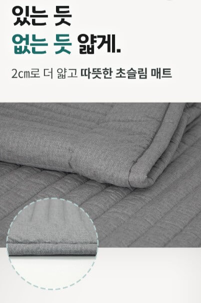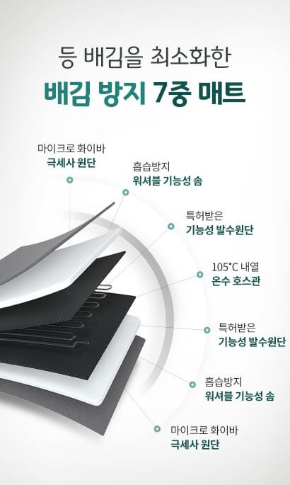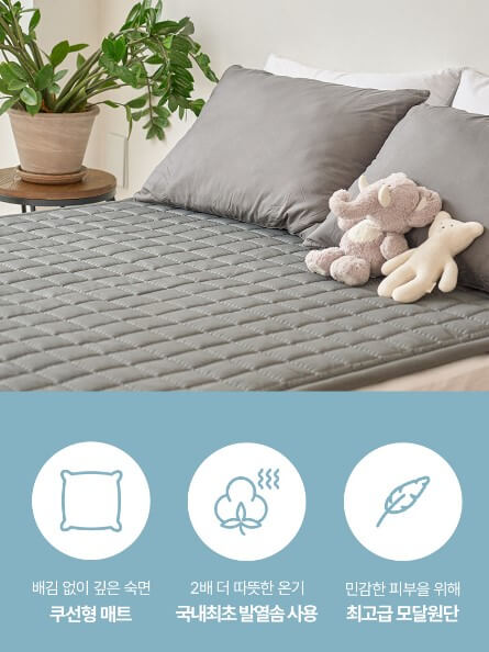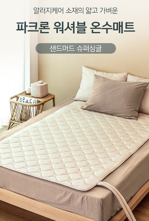 7중 구조 매트로 꼭 필요한 기능서 소재들만 모아 만들었으며 인증기관 테스트로 신뢰할 수 있는 워셔블 온수매트입니다. 알러 앤드 원단은 집먼지 기를 차단합니다.이지 드라이드 충전재가 들어 있어 통세탁이 가능합니다.