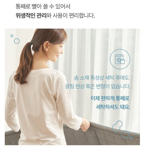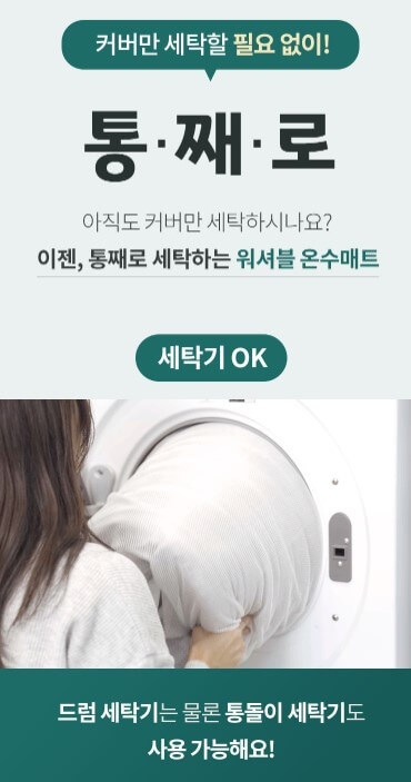 워셔블 온수매트로 세탁이 가능한데요. 드럼 세탁기 통돌이 세탁기 둘 다 문제없습니다. 저온 또는 중온으로 건조기 사용 건조도 가능합니다.