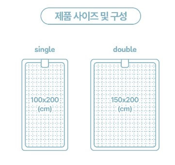 워셔블 온수매트로 통째 세탁이 가능합니다. 간편하게 접어서 보관할 수도 있습니다. 사이즈는 싱글과 더블 두 가지가 이며, 분리 온도조절이 가능합니다.