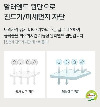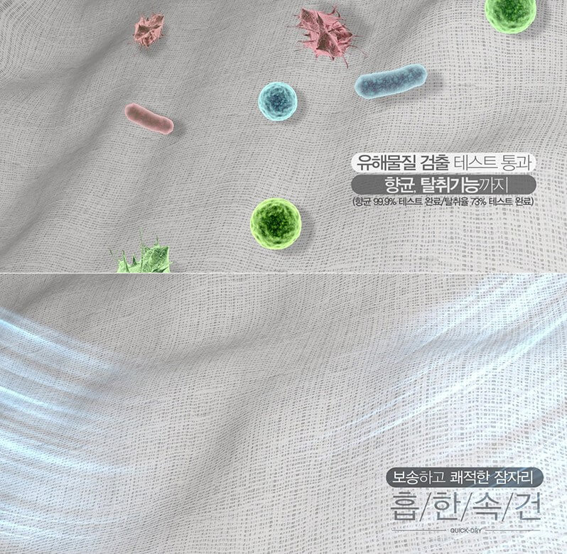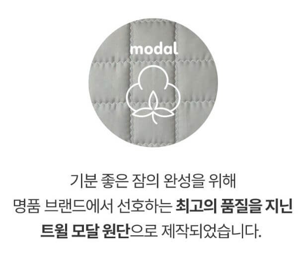 부드러움을 한층 높인 모달 원단은 신축성이 좋고 복원력도 우수하여 오래 사용 가능하며 세탁에도 뭉침, 변형이 거의 없으며 섬유질의 조직을 작게 하여 진드기의 서식을 막았습니다.
