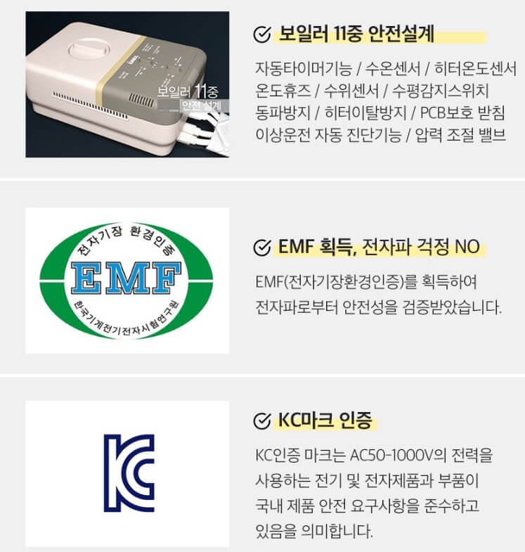 좌우 분리 난방 조절이 가능하고 자동 타이머 기능, 수온 센서, 히터 온도센서 등 11중으로 안전하게 설계를 하였으며 전자파 걱정이 없는 전자기장 환경인증 EMF 획득한 제품입니다.