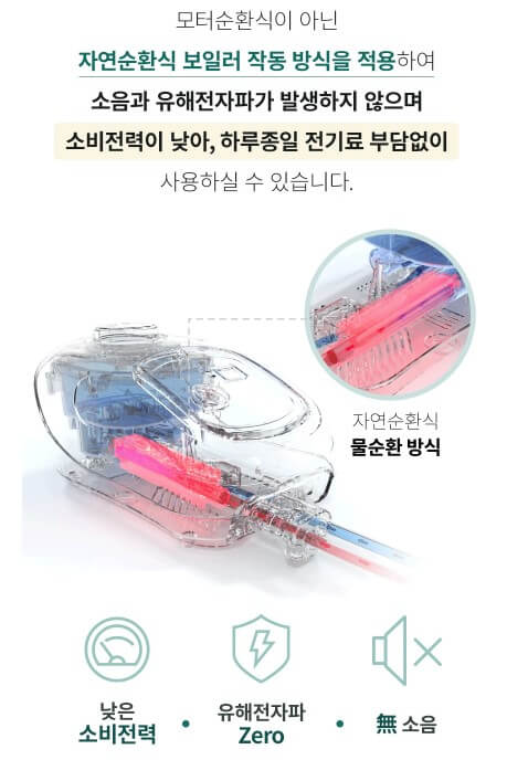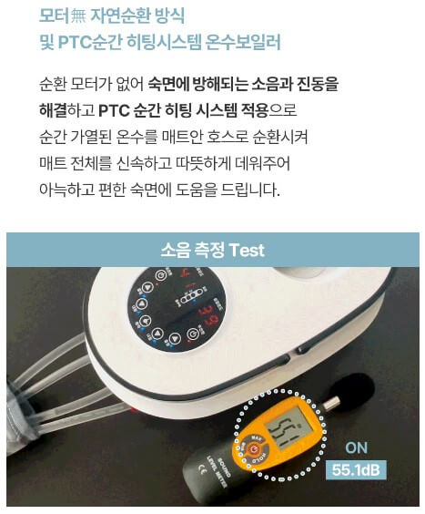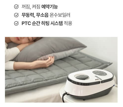 자연순환식 보일러 작동 방식을 적용하여 소음과 유해한 전자파가 발생하지 않습니다. 등배 김을 최소화하기 위해 배김 방지 7중 매트를 사용 쿠션감을 강화하여 편안하게 누울 수 있습니다.