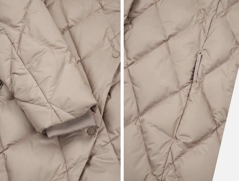 다이아 퀼팅이 독보이는 코오롱 여성 롱 패딩입니다. 퀼팅 무늬와 베이지 색상은 고급스러운 느낌을 주는데요.