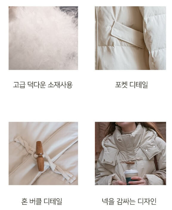겉면에는 코팅 처리를 하여 기본 생활방수가 가능하고 오염도가 낮습니다. 고밀도 다운백과 다운프루프 소재를 사용하여 털 빠짐을 보완하였으며 색상은 블랙과 크림 두 가지입니다.