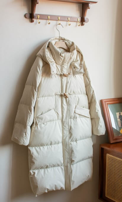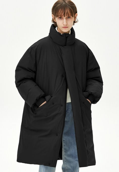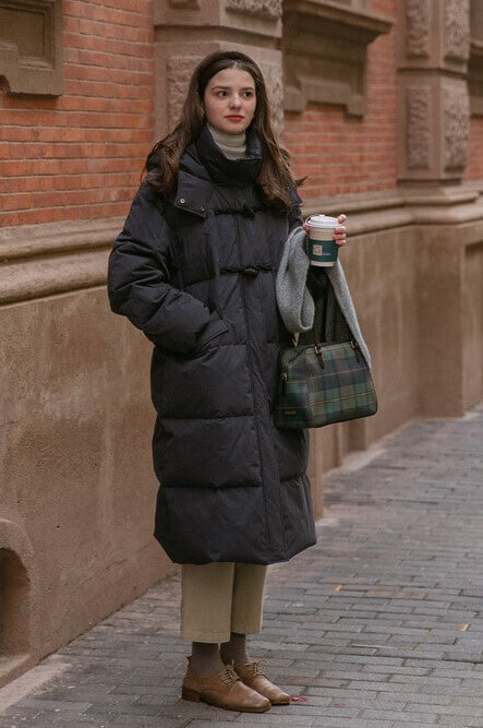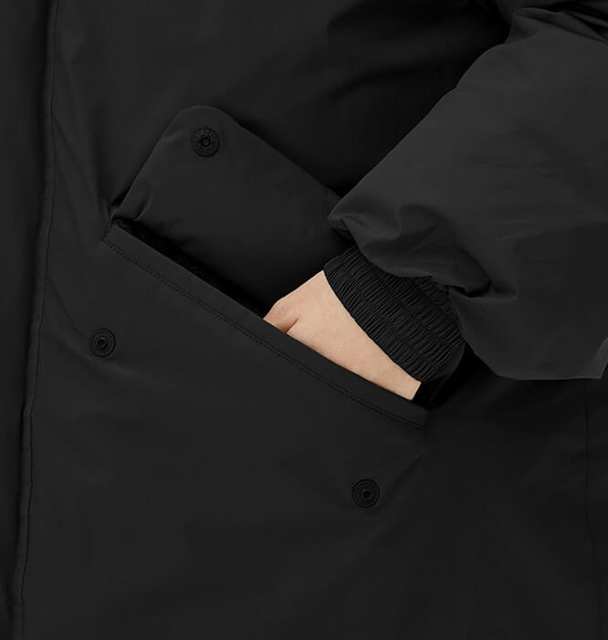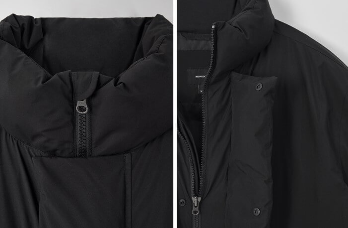 롱기장은 한겨울에 다리까지 따뜻하게 보호해주며, 특히 혼 버클 디테일이 눈에 띄는 포인트입니다. 넥까지 올라오는 디자인과 중앙의 지퍼로 보온력을 높였으며, 모자가 달려 있어 추운 한겨울에도 착용하기에 좋습니다.