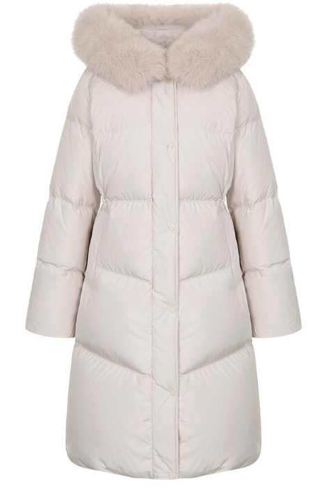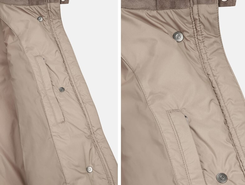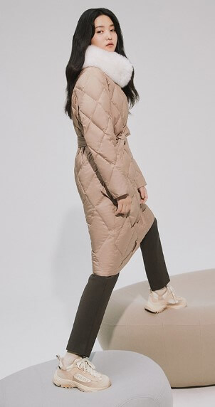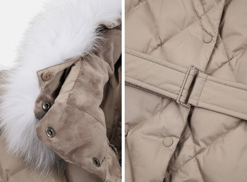 상단의 넥라인에는 폭스퍼를 사용하여 보온성과 함께 옷의 고급스러운 느낌을 더욱 살렸습니다. 허리 벨트는 탈부착이 가능한 착용으로 슬림한 핏과 편안한 핏을 동시에 연출할 수 있습니다.