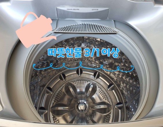 ①세탁기통 내부에 온수를 1/3 이상 넣고 1~2시간을 기다립니다. 시간이 지난 후 헹굼 1회와 탈수 1회를 시킵니다.