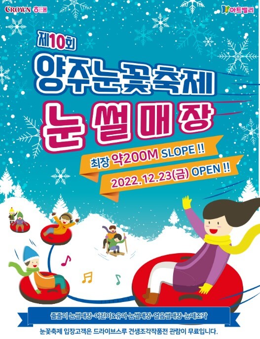 첫 번째 소개해 드릴 겨울축제는 서울에서 1시간 정도 거리에 위치한 양주시 장흥면에서 열리는 양주 눈꽃축제입니다. 양주 겨울 축제장은 이미 썰매장으로 인기를 끌고 있는 곳이기도 한데요.