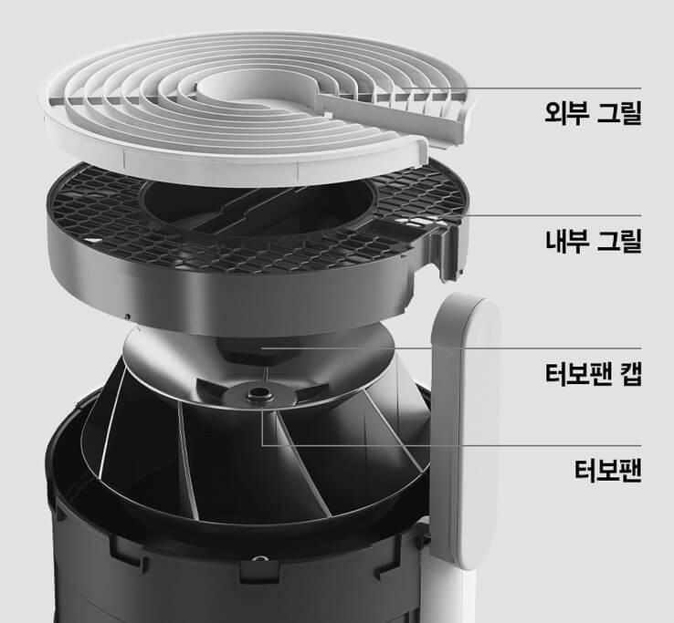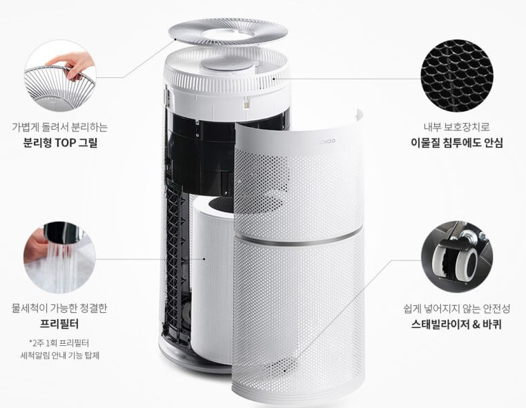 프리필터는 물세척이 가능해 항상 청결하게 사용할 수 있으며 주 2회 프리필터 세척 알림 기능이 있습니다. 그릴 부문 역시 분리가 가능하며 바닥에는 바퀴가 달려 있어 어디든 쉽게 이동할 수 있습니다.