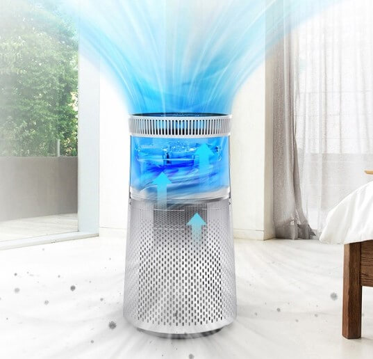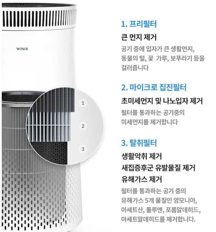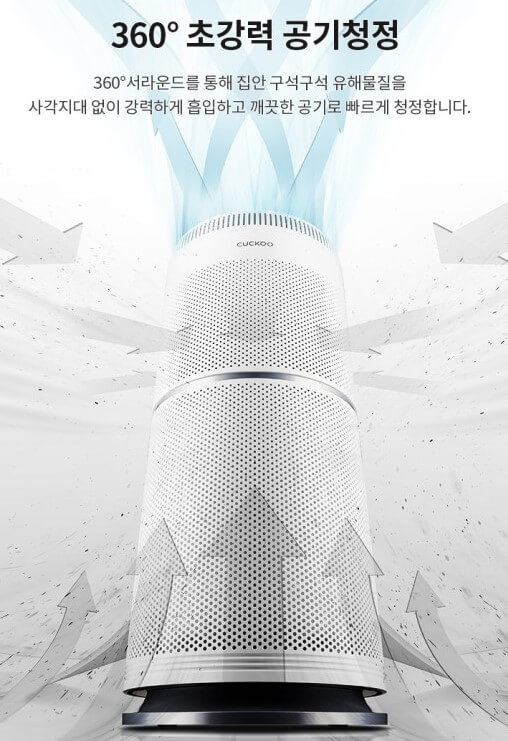 원형필터가 내장되어 360도에서 미세먼지를 흡입 후 깨끗한 공기를 배출합니다. 0.01μm의 초미세먼지까지도 제거하는 마이크로 집진필터와 생활먼지, 생활악취를 제거하는 프리필터 및 탈취 필터를 갖추고 있어 새집증후군 유발 물질들을 제거하는 효과가 있습니다. 당연히 CA인증도 받은 제품입니다.