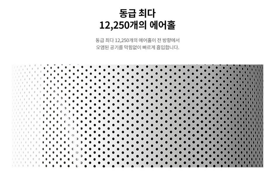 공기청정기 이름 뒤에 붙은 12000이 의미하듯 동급 공기청정기 대비 최다 에어홀 12,250개를 가지고 있어 360도 전 방향에서 오염된 공기를 빠르게 흡입하고 정화된 공기를 더 넓게 내보내고 있습니다.