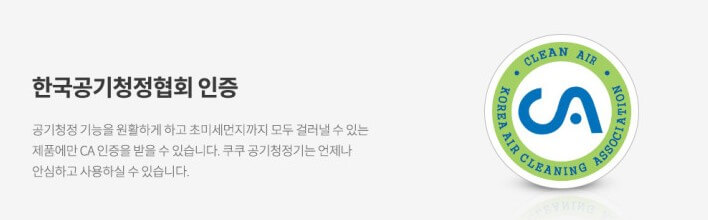 CA인증은 실내공기청정기 단체표준인증으로 한국공기청정기 협회에서 소비자가 신뢰할 수 있는 공기청정기 제공을 위해 인증해 주는 마크로 미세먼지 제거능력, 유해가스제거율, 오존발생량, 소음 등의 항목 기준을 통과한 안심하고 편리하게 사용할 수 있는 제품이라는 표시 입니다.