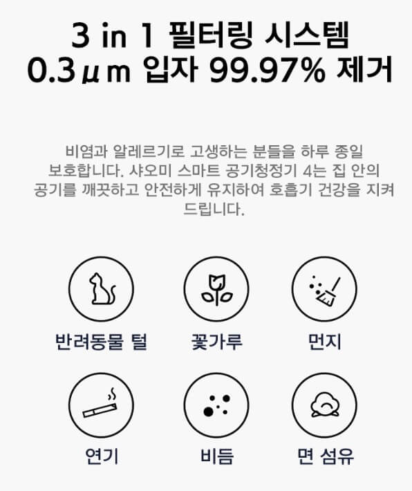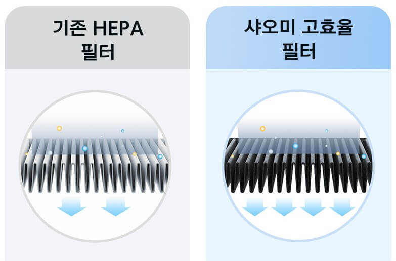 샤오미 미에어 공기청정기는 정전기식 및 기계식 필터를 조합해 만든 필터로 0.1μm의 초미세먼지도 제거할 수 있으며 꽃가루, 애완동물 각질, 연기를 필터링할 수 있습니다.