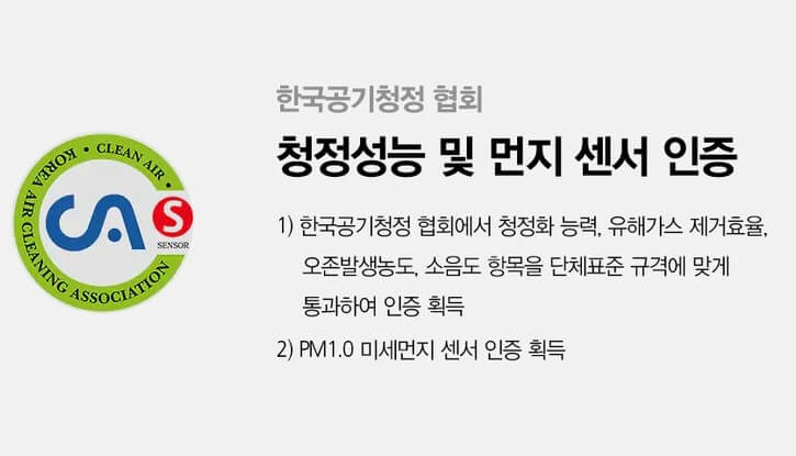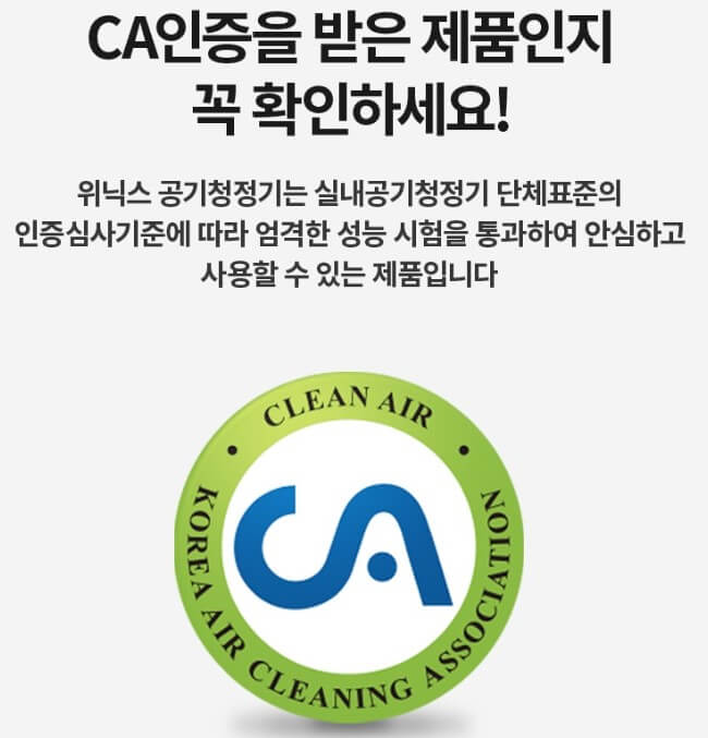 CA인증은 실내공기청정기 단체표준인증으로 한국공기청정기 협회에서 소비자가 신뢰할 수 있는 공기청정기 제공을 위해 인증해 주는 마크로 미세먼지 제거능력, 유해가스제거율, 오존발생량, 소음 등의 항목 기준을 통과한 안심하고 편리하게 사용할 수 있는 제품이라는 표시 입니다.