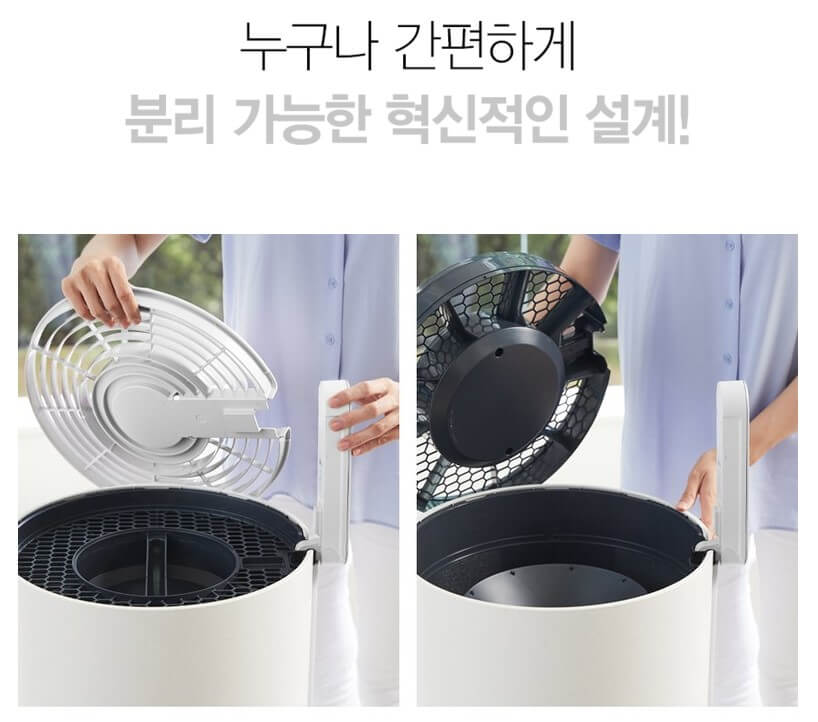 프리필터는 물세척이 가능해 항상 청결하게 사용할 수 있으며 주 2회 프리필터 세척 알림 기능이 있습니다. 그릴 부문 역시 분리가 가능하며 바닥에는 바퀴가 달려 있어 어디든 쉽게 이동할 수 있습니다.