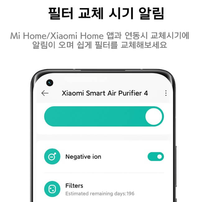 샤오미앱과 연동하여 스마트 컨트롤이 가능하며 필터의 수명도 알려줍니다. 직관적인 작동스위치로 조작이 간편하다는 것도 장점입니다.