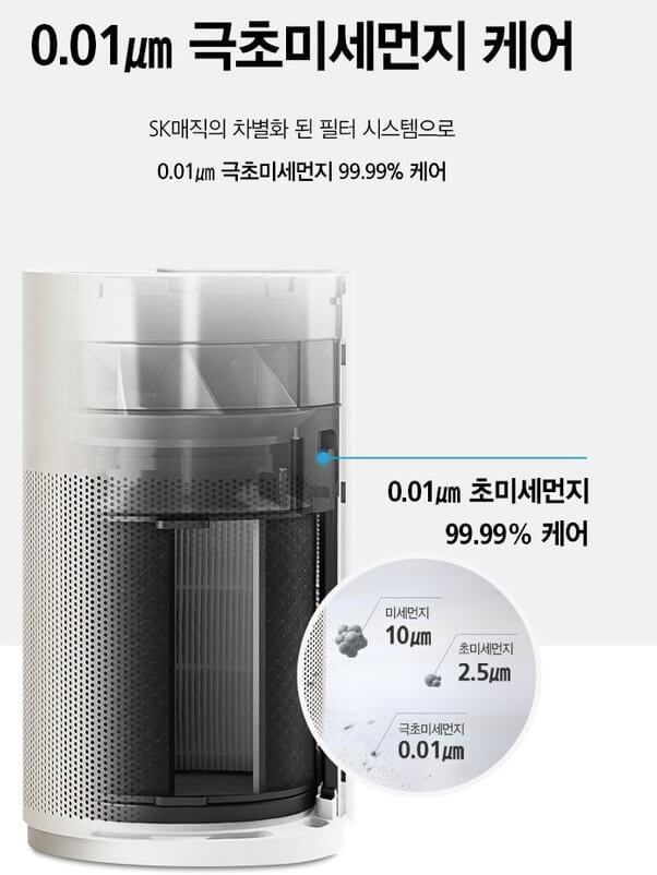 SK올클린 공기청정기는 그릴의 내부, 외부, 터보팬 부분을 쉽게 분리하여 물로 세척할 수가 있습니다. 미세먼지 및 초미세먼지는 물론 0.01μm 초미세먼지까지 케어해 주는 필터를 사용하고 있습니다.