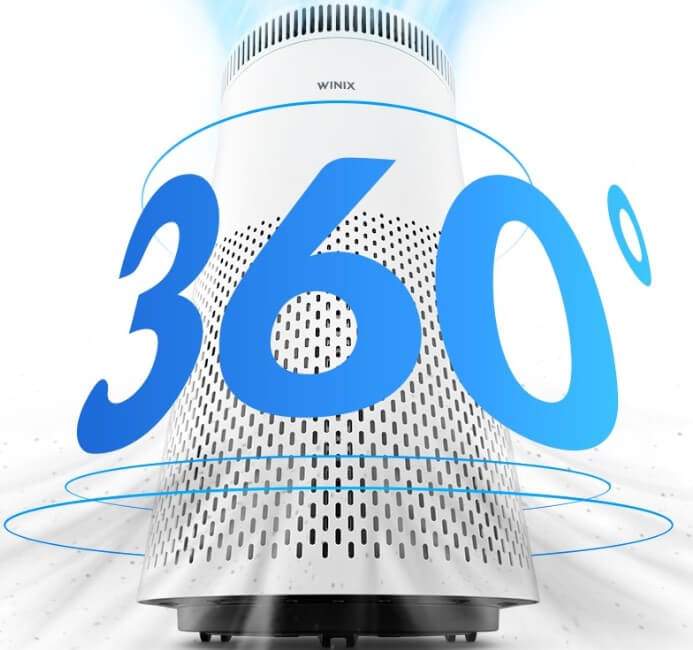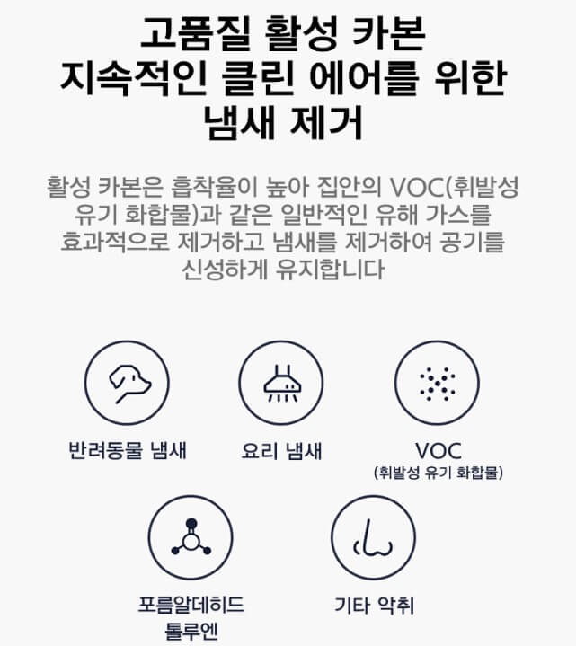 원형필터가 내장되어 360도에서 미세먼지를 흡입 후 깨끗한 공기를 배출합니다. 0.01μm의 초미세먼지까지도 제거하는 마이크로 집진필터와 생활먼지, 생활악취를 제거하는 프리필터 및 탈취 필터를 갖추고 있어 새집증후군 유발 물질들을 제거하는 효과가 있습니다. 당연히 CA인증도 받은 제품입니다.