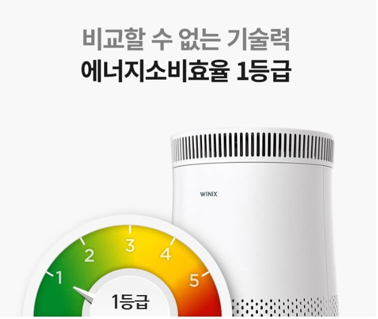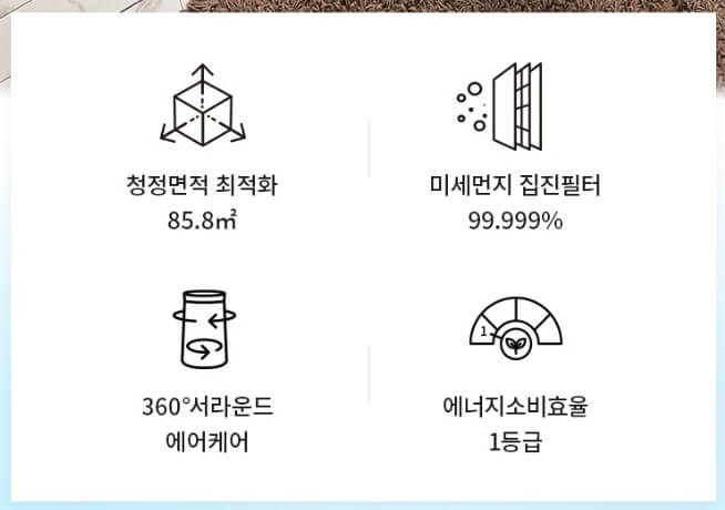 실내의 먼지, 유해물질, 냄새 그리고 밝기까지 저절로 감지하는 트리플 스마트 센서를 가지고 있어 실내의 공기를 종합적으로 스스로 분석하여 상황에 알맞은 공기청정을 자동으로 진행합니다. 에너지소비효율도 1등급입니다.