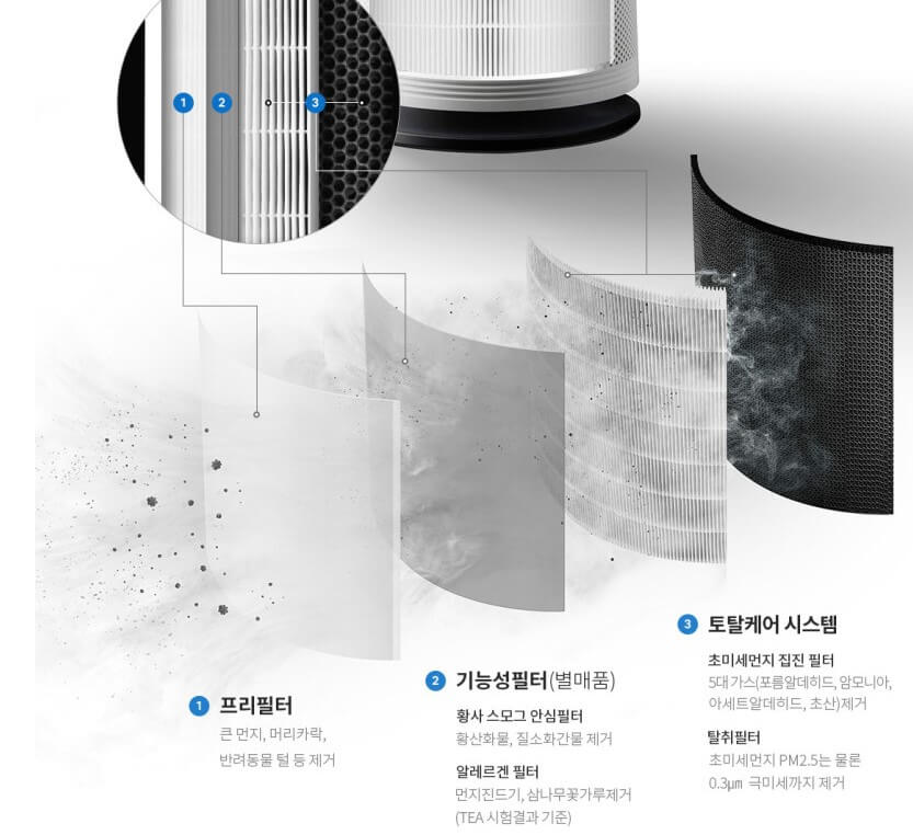 PM1.0 센서로 아주 작은 미세먼지 감지하며 TVOC감지 센서로 새집증후군 물질도 감지하여 실내 공기를 분석합니다. 공기청정기의 필터를 프리필터, 토탈케어시스템 필터로 되어 있어 큰 먼지, 5대 가스(포르알데히드, 암모니아, 아세트알데히드, 초산), 초미세먼지 PM 2.5는 물론 0.3μm까지도 제거합니다. 별도구매로 기능성 필터를 구매할 수 있으며 기능성필터는 황사, 스모그, 먼지진드기, 꽃가루 제거 기능이 가능합니다.