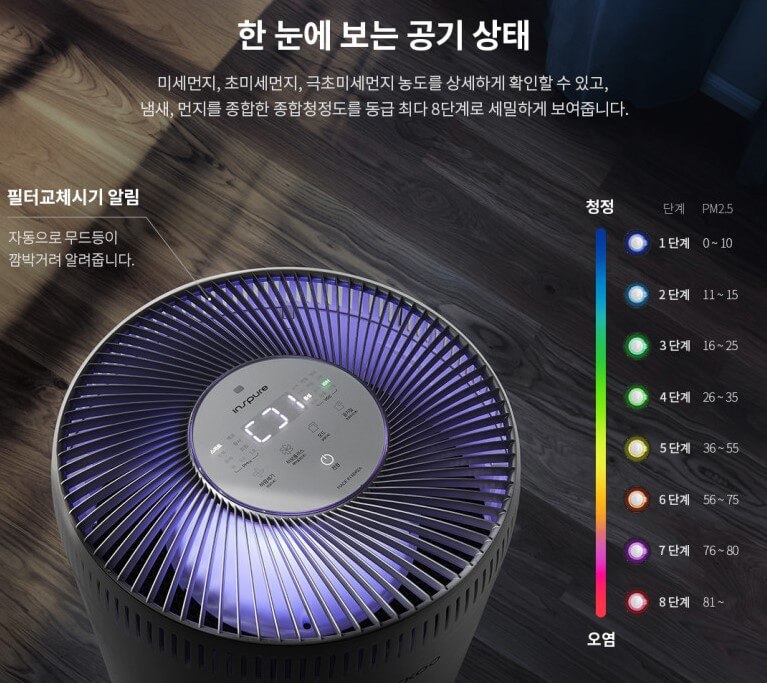 IoT기능으로 언제 어디서나 쉽게 공기질 모니터링 및 공기청정기를 컨트롤할 수 있습니다. 초미세먼지의 농도수치를 표시해 주며 4단계에 걸쳐 공기질 상태를 나타내 줍니다.