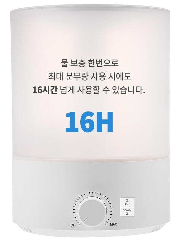 한번 물을 보충하면 16시간 이상 작동 할수 있으며, 내부물을 확인 할 수 있는 반투명 물탱크라는 것도 장점입니다. 뚜껑을 열지 않고 상부에서 급수가 가능하며 구조가 간편하게 되어 있어 세척이 편리합니다.