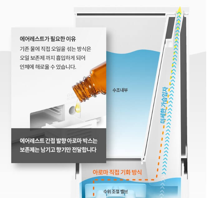 만약 아로마 오일을 가습기와 같이 사용하는 분이라면 더 좋은 제품입니다. 아로마박스가 따로 있어 오일은 남기고 향기만 몸에 전달하여 더욱 안전합니다.