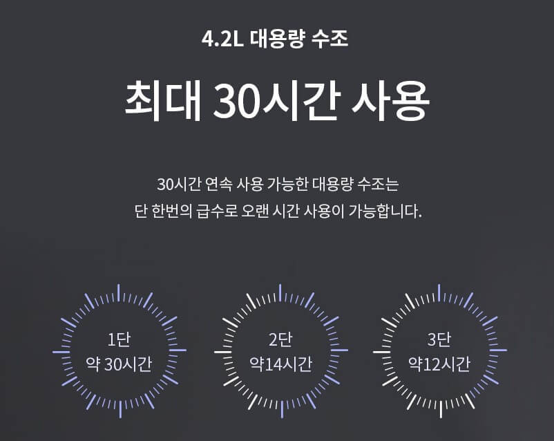 4.2L의 대용량 수조에 최대 30시간까지 가동이 가능합니다. 가습기 상부를 열어 간편하게 물보충이 가능합니다.