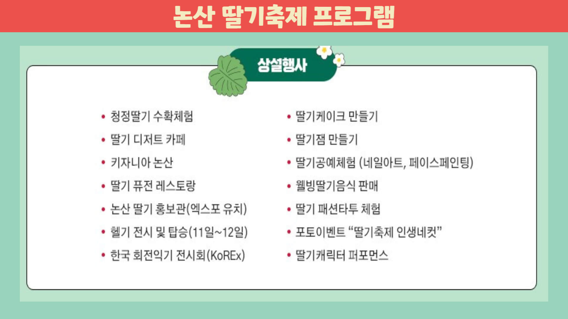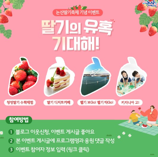 딸기 하면 논산 논산 하면 딸기! 논산 딸기가 유명하다는 것은 다 알고 계실 텐데요. 논산에서 딸기축제까지 개최한다고 하니 기대하지 않을 수 없네요. 맛있는 딸기를 먹는 것만으로도 행복한데 다양한 행사까지 더해진 딸기축제는 어떨까요?