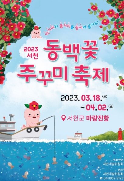 서천 동백꽃 주꾸미 축제기간은 23.3.18.(토) ~ 4.2.(일) 16일간 진행됩니다. 축제장소는 서천군 마량진항 및 마량리 동백나무숲 일대에서 진행(충남 서천군 서면 서인로 56)됩니다.