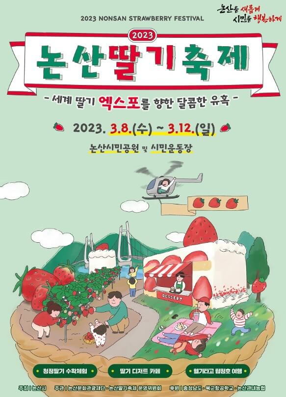 지난 31일 문화체육관광부와 한국관광공사가 발표한 K-컬처 관광이벤트 100선에 논산딸기축제가 당당히 선발되었다고 하니 진짜 안 가볼 수가 없겠네요. 논산딸기 축제기간은 23. 3. 8.(수) ~ 3.12.(일) 5일간 진행됩니다. 논산 딸기축제 장소는 논산시민공원 및 시민운동장입니다.