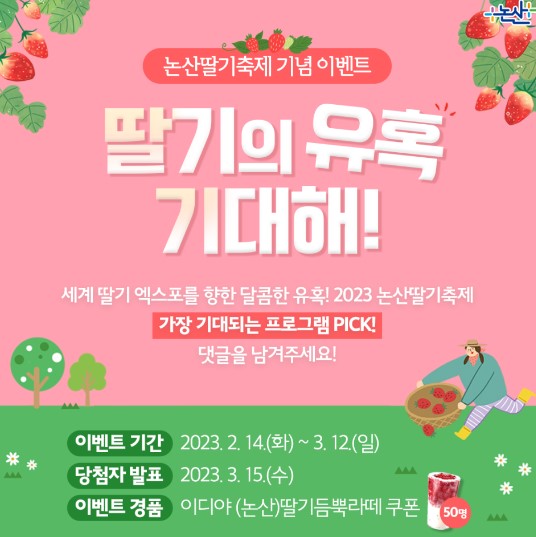 ☝🏻잠깐! 논산딸기축제기념 이벤트가 진행 중인데요. 당첨 시 이디야 딸기라테 쿠폰이 증정된다고 합니다. 논산공식 블로그에 가서 참여하고 맛있는 딸기라떼 쿠폰도 받아 가세요!