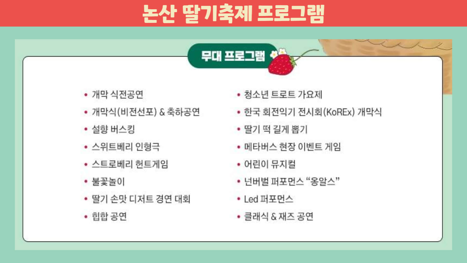 논산 딸기축제에는 다양한 프로그램이 준비되어 있는데요. 무대공연으로는 개막식 축하공연을 비롯하여 인형극, 트로트 가요제, 어린이 뮤지컬, 재즈공연 등을 볼 수 있습니다.