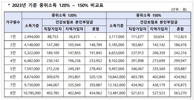 ①소득 : 가구원의 소득이 기준중위소득 120%이상 ~150% 이하여야 합니다. 이때 기준중위소득은 최근 3개월(22.12.~23.2.) 평균 건강보험료(노인장기요양료제외) 부과액/납부액을 기준으로 정합니다.