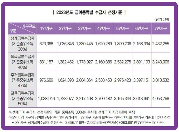 기초생활수급자 급여 종류별 소득인정액 기준이 각각 다릅니다. 가구의 소득과 재산을 합한 금액이 소득인정액 기준 이하가 되어야 기초생활수급자로 선정될 수 있습니다. 기초생활자 급여종류별 소득인정액은 다음과 같습니다.