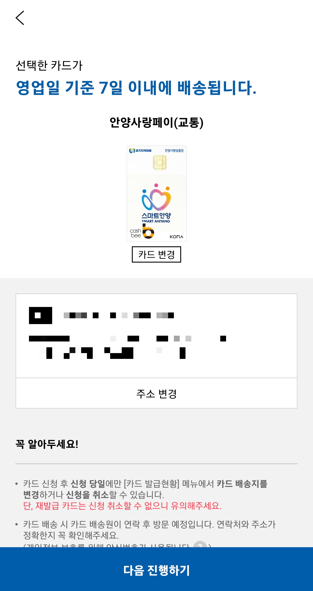 ⑧카드는 7일 이내에 배송될 예정이라는 메시지가 뜹니다. 신청은 끝났습니다. 이제 카드가 도착하면 앱을 통해 등록을 하면 됩니다.