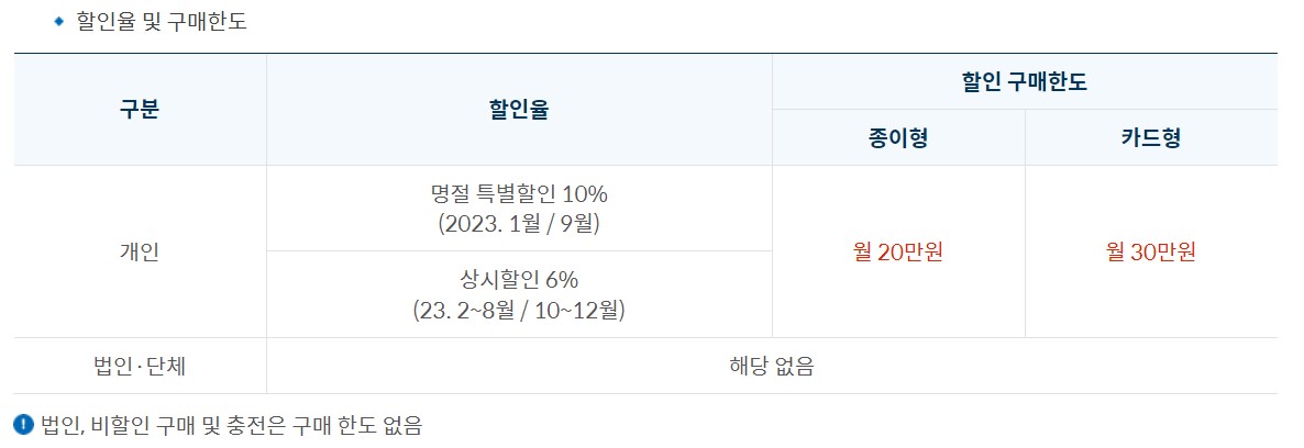 안양사랑페이카드는 상시 6%의 할인을 받을 수 있으며 명절이 속해있는 달은 10%의 할인을 받을 수 있습니다. 할인 구매한도는 지류의 경우 최대 월 20만 원, 카드의 경우 최대 월 30만 원까지입니다.