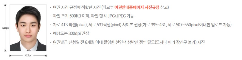 인터넷 여권발급 시 사진은 일반여권 사진규정과 같으며 파일크기는 500KB 이하, 가로 413픽셀, 세로 531픽셀 사이 사이즈를 권장하고 있습니다.