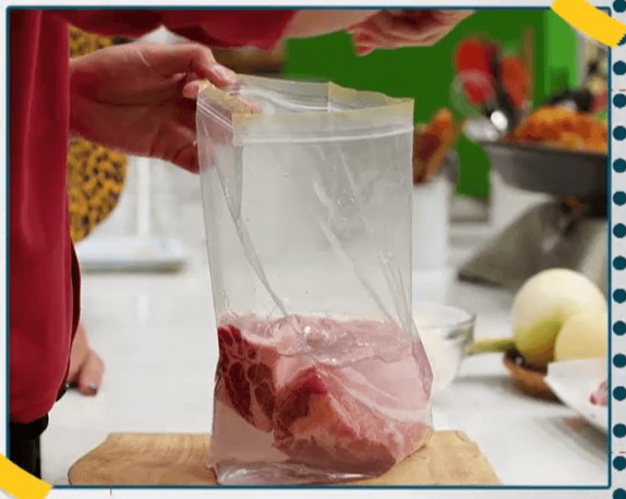 2. 지퍼백에 목살 1kg을 넣은 후 잘 밀봉해 1시간 동안 재워줍니다.