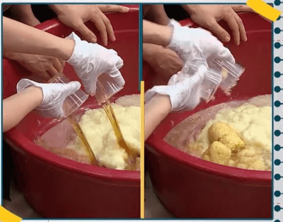4. 믹서에 간 생새우, 대두콩, 새우젓, 양파, 배 간 것을 대야에 넣고 함께 섞어 줍니다.