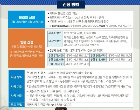 광명사랑카드가 없더라도 방문신청 시 현장에서 발급이 가능합니다. 또는 세대주가 아닌 세대원의 카드로도 받을 수 있다는 점 참고하시기 바랍니다.