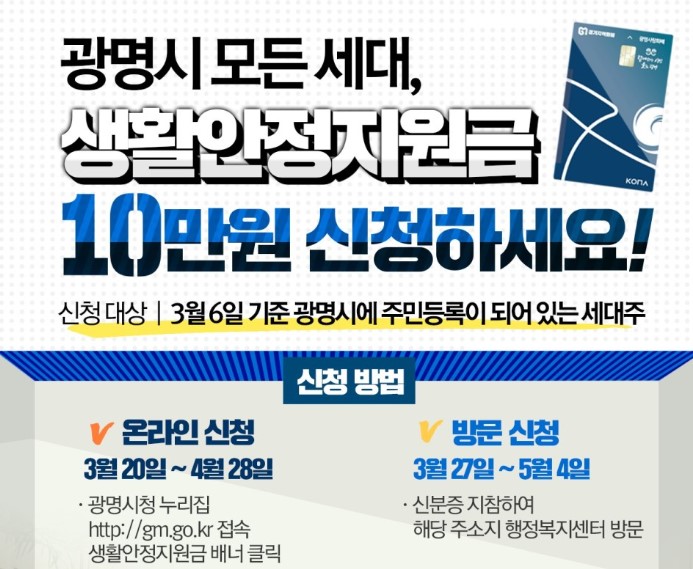 광명사랑카드가 없더라도 방문신청 시 현장에서 발급이 가능합니다. 또는 세대주가 아닌 세대원의 카드로도 받을 수 있다는 점 참고하시기 바랍니다.