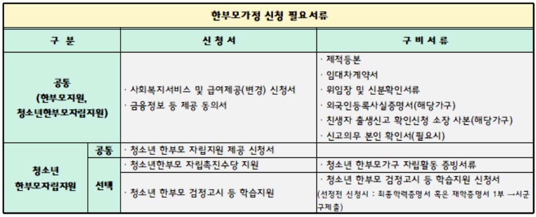 한부모 가정은 온라인, 오프라인 신청이 모두 가능합니다. 온라인 신청 시 복지로 사이트에서 신청이 가능하며 오프라인 신청 시에는 보호자의 주소지 행정복지센터를 방문해 신청할 수 있습니다. 신청 시 필요서류는 다음과 같습니다.