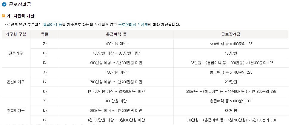 급여에 따른 근로장려금 금액 확인이 가능한 산정표가 있습니다. 해당 산정표로 소득구간 확인하시면 근로장려금, 자녀장려금 금액을 확인할 수도 있습니다.