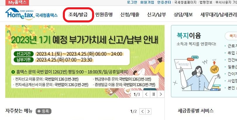 ②메인화면 상단에 조회/발급 메뉴를 클릭합니다.