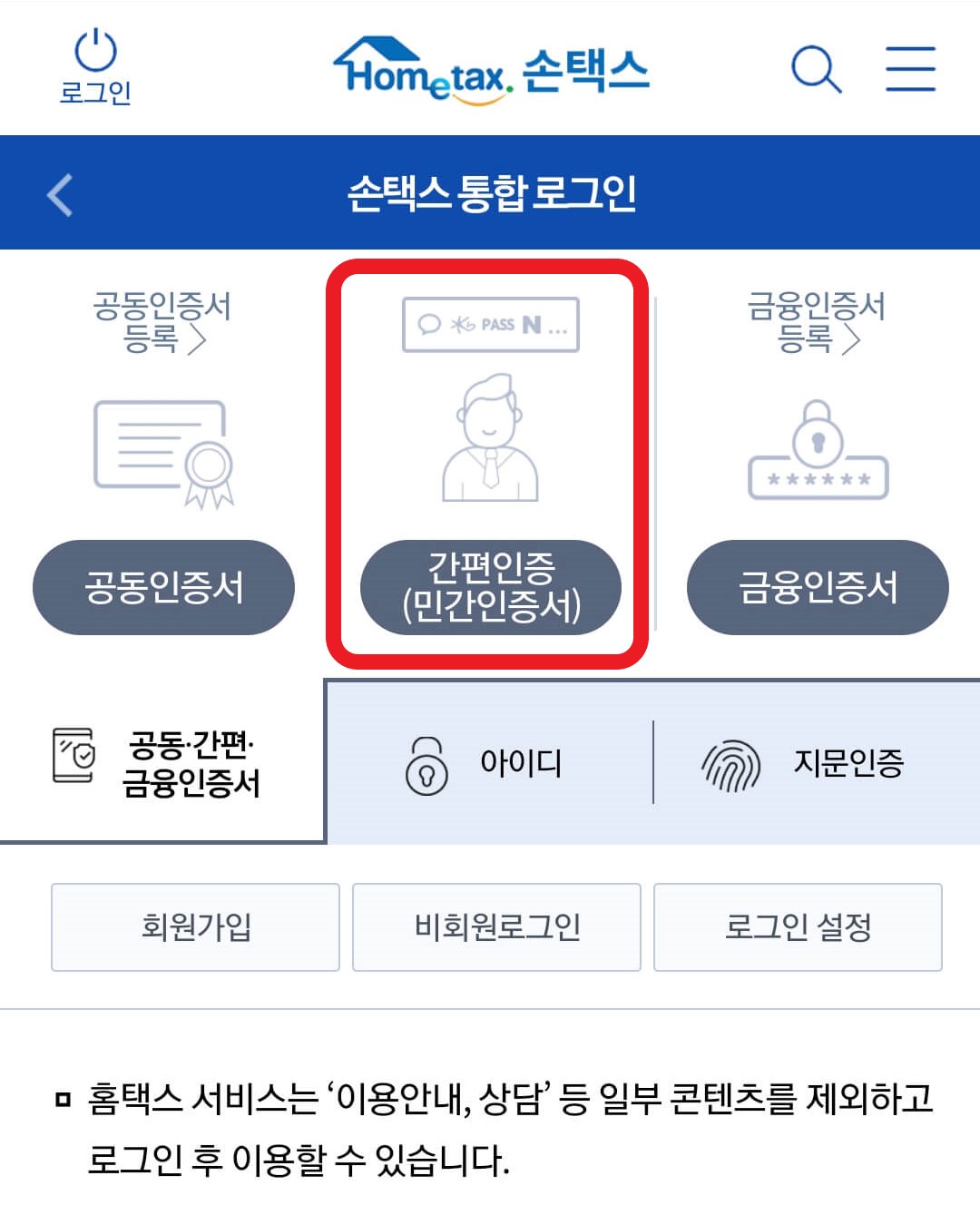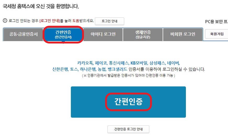 ④손택스 통합 로그인화면에서 간편 인증을 선택합니다.