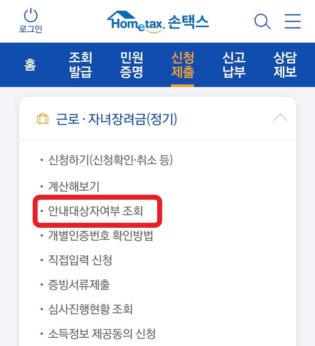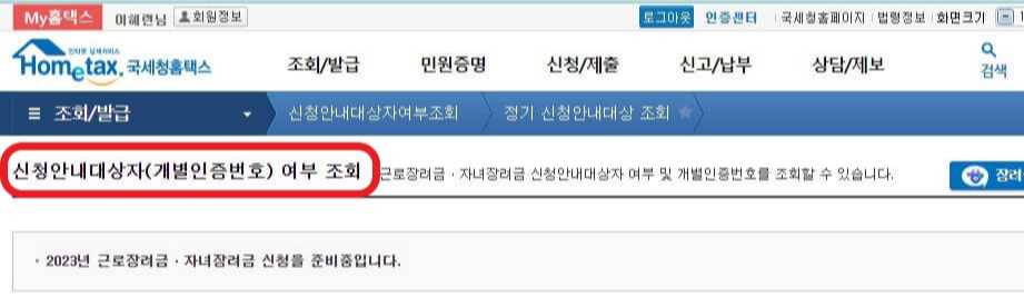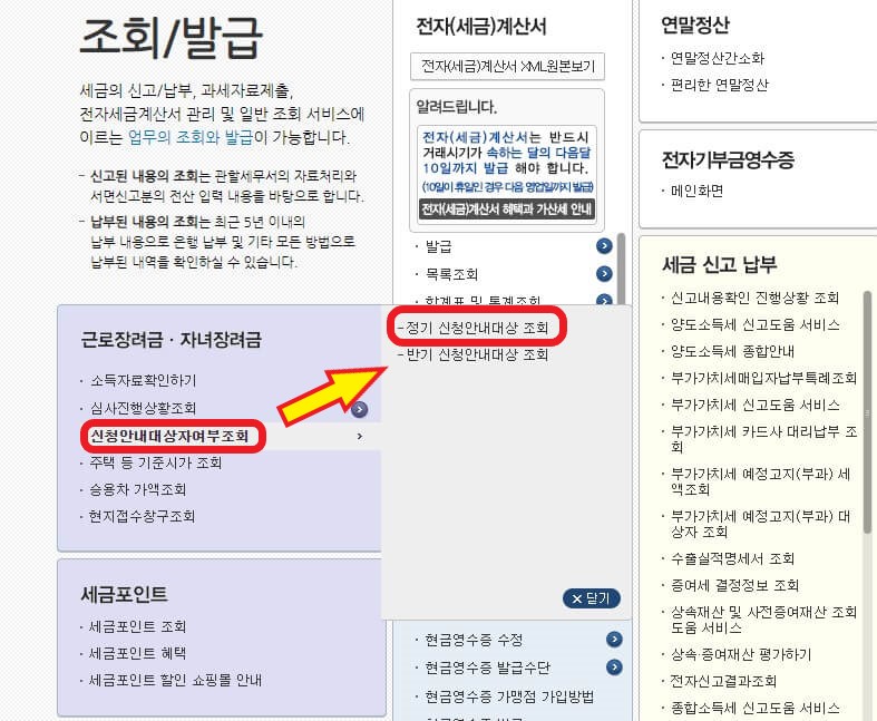 ③근로장려금, 자녀장려금 영역에서 신청안내대상자여부조회 👉 정기 신청안내대상 조회를 클릭합니다.