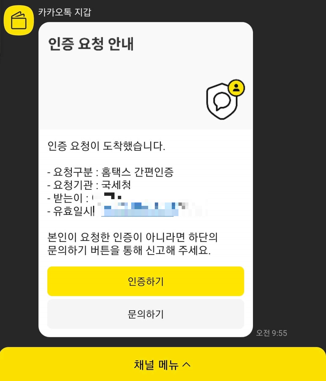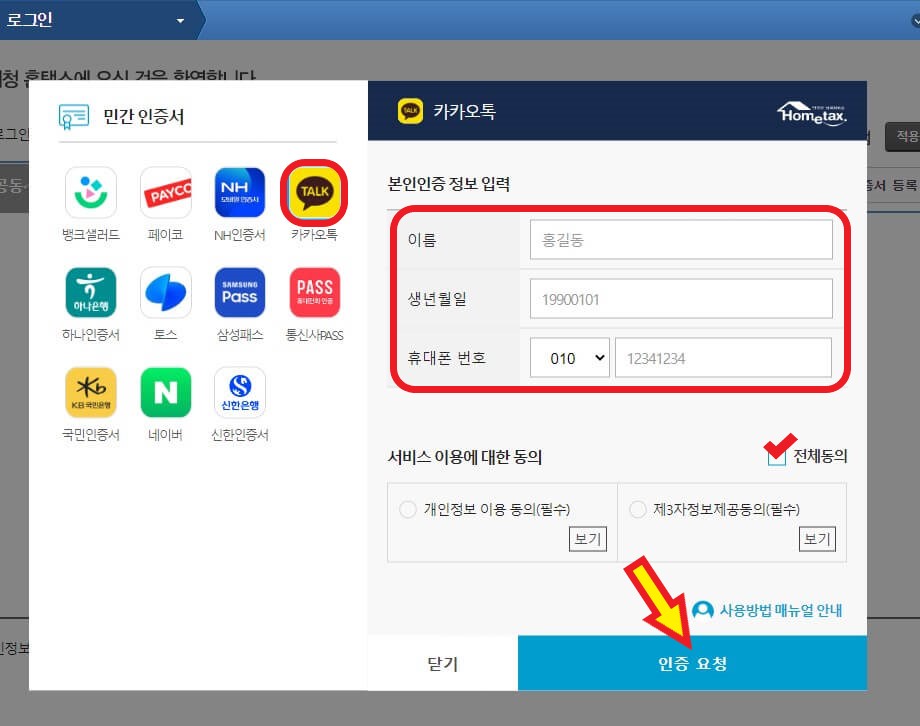 ⑤저는 카카오톡 간편인증을 실시했습니다. 개인정보를 입력하고 전체동의 체크 후 인증요청을 클릭합니다.
