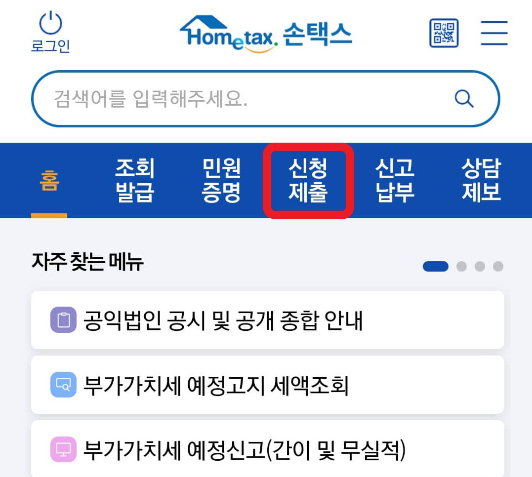 ②홈택스(손택스) 메인 화면 상단 메뉴 중 신청제출을 터치합니다.