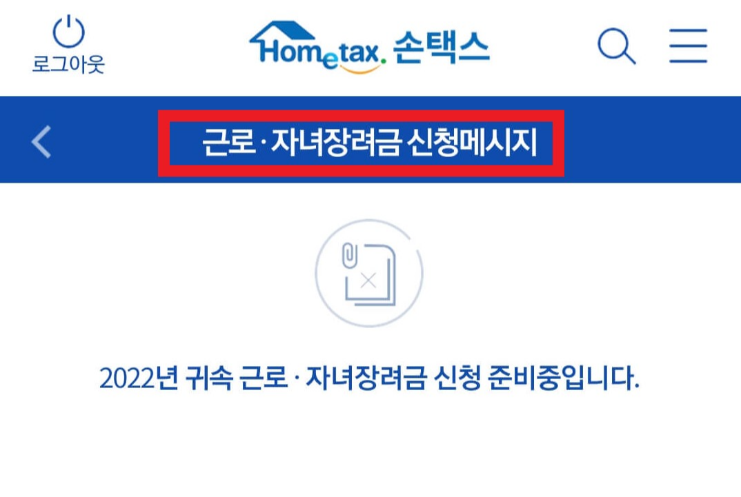 ⑥인증이 완료되면 근로자녀장려금 신청메시지 화면에서 근로자녀장려금 안내대상자 여부를 확인할 수 있습니다. 아직 조회기간이 아니여서 조회되는 내용이 없는데요. 실제 조회내용은 아래 예시와 같습니다.